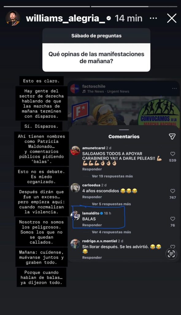 En la misma línea, agregó: “Mañana cuídense, muévanse juntos y graben todo. Porque cuando hablan de balas, ya dijeron todo”, escribió en sus historias de Instagram.