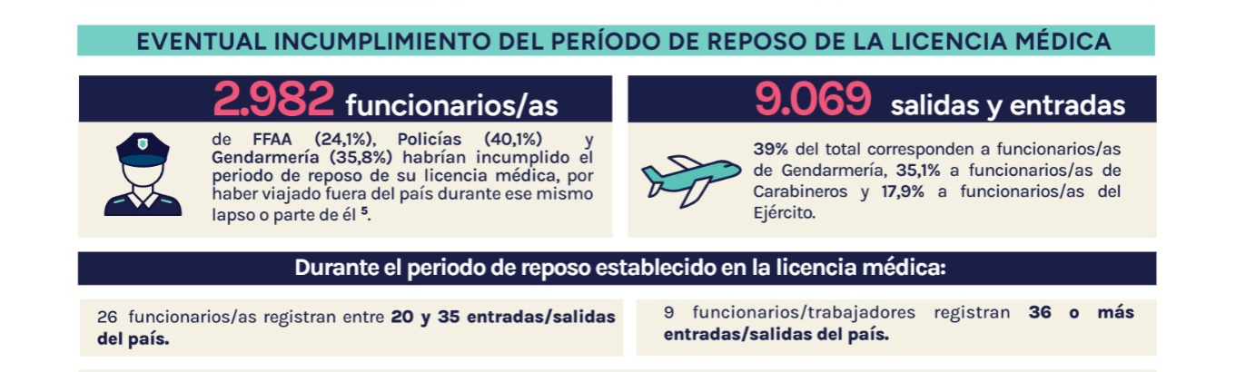 La Contraloría General de la República (CGR) reveló que al menos 2.982 funcionarios de las Fuerzas Armadas, Carabineros, Policía de Investigaciones (PDI) y Gendarmería habrían incumplido el reposo médico asociado a sus licencias, al registrar salidas del país durante dicho periodo.