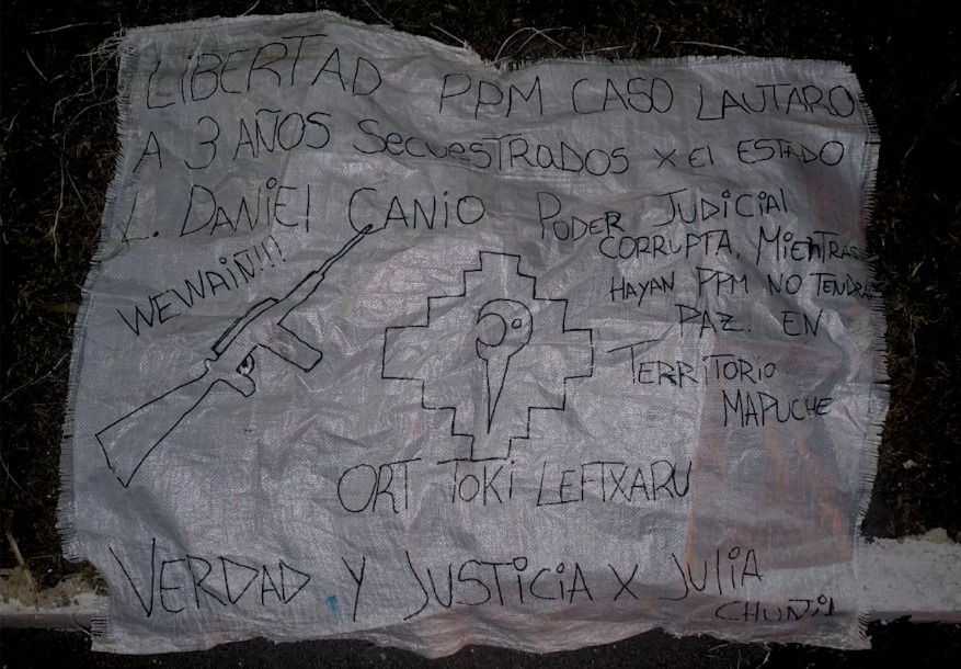 Durante las pericias realizadas en el lugar, los equipos investigativos encontraron un lienzo adjudicatorio atribuido a la ORT Toki Leftxaru, en el que se exige la libertad de los denominados “presos políticos mapuche” del caso Lautaro, se cuestiona al Poder Judicial y se pide esclarecer la desaparición de Julia Chuñil.