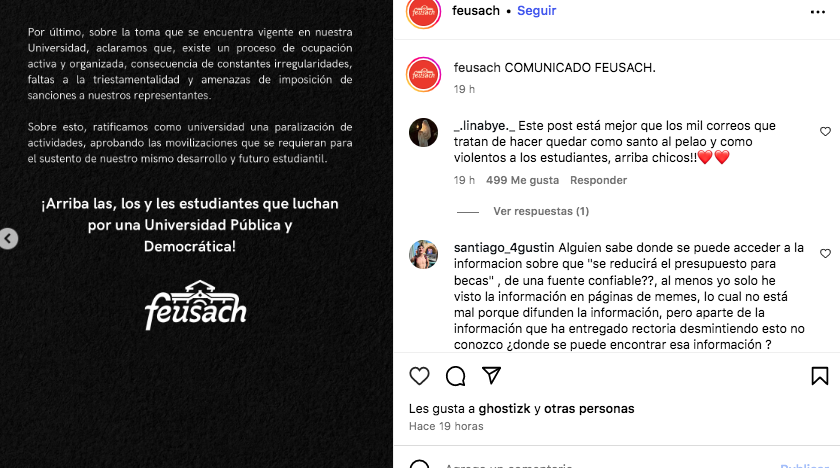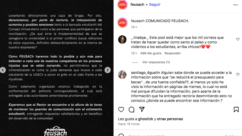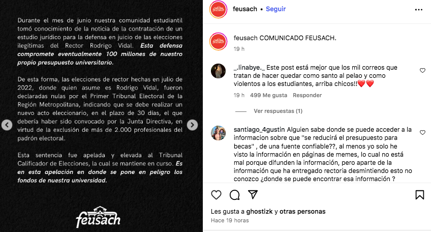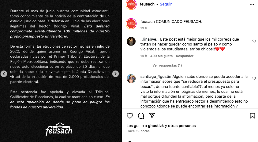 Por su parte, Feusach dio a conocer en un comunicado de prensa publicado en su cuenta de Instagram que la comunidad estudiantil, “tomó conocimiento de la noticia de la contratación de un estudio jurídico para la defensa en juicio de las elecciones ilegítimas del rectos Rodrigo Vidal. Esta defensa compromete eventualmente 100 millones de pesos de nuestro propio presupuesto universitario”.
