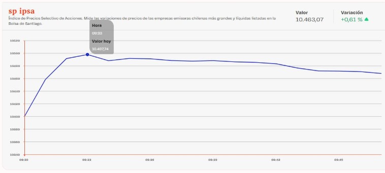 A las 09:33 horas, el índice IPSA alcanzó los 10.497,74 puntos, frente a los 10.400 puntos con que cerró la jornada del viernes, lo que representa un incremento de 0,9%. El avance fue liderado por los títulos de Santander, que subieron 2%, Copec con un alza de 2% y SQM-B con un aumento de 1,8%.