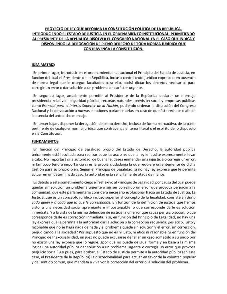 El proyecto, ingresado el pasado 23 de noviembre bajo el boletín N° 17989-07, se encuentra actualmente en la Comisión de Constitución. La iniciativa propone crear la figura de “Estado de Justicia”, modificando el artículo 72 de la Carta Fundamental.